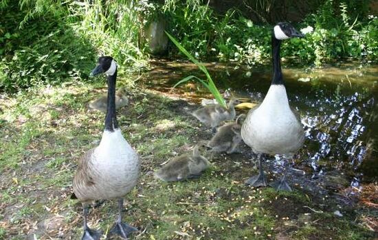 An einem heißen Sonntagnachmittag trauten Anwohner in Graben-Neudorf (Baden-Württemberg) ihren Augen nicht als sie in ihrem Garten ein Kanadisches Wildgänsepaar mit 4 Jungen entdeckten.