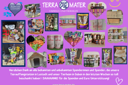 Das sind nur Beispiele für Eure Unterstützung. Wir danken ALLEN für die Geldspenden, Futter- und Sachspenden über unsere Amazon Wunschlisten, private und anonyme Spenden, die per Post kamen oder persönlich in unserem Tierheim in Guben, auf unserer Tierauffangstation in Lustadt und in Graben-Neudorf vorbeigebracht wurden.