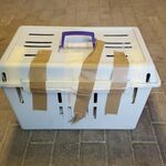 Im Treppenhaus eines Mehrfamilienhauses stand ein mit Klebeband verschlossener Katzenkorb, auf dem ein Zettel lag: Zu verschenken.