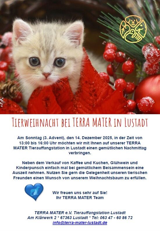 Die Adventszeit steht vor der Tür – und bei TERRA MATER e.V. wird sie besonders schön! Wir laden Sie herzlich zu unserer Tierweihnacht 2025 auf unserer Auffangstation in Lustadt ein.