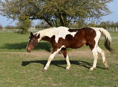 Brisko ist ein außergewöhnlich schöner Pinto-Wallach, der nach schweren Schicksalsschlägen seiner Menschen den Weg auf unsere Tierauffangstation in Lustadt gefunden hat. Mit seiner ruhigen Ausstrahlung und seinem sanften Wesen hat er sich schnell einen festen Platz bei uns erobert. Aufgrund einer Steifigkeit in der Hinterhand ist Brisko nicht mehr reitbar. In unserer Obhut darf er dennoch genau das Leben führen, das ein Pferd verdient: in einem artgerechten Offenstall, mit regelmäßigem Weidegang, im Kontakt zu Artgenossen und mit liebevoller, verlässlicher Betreuung. Dank der Unterstützung seiner Patinnen und Paten ist es möglich, Brisko Sicherheit, Fürsorge und Lebensqualität zu schenken. So kann er seinen Lebensweg bei uns in Ruhe und Würde gehen – bis zu seinem natürlichen Lebensende. 🐴🤍