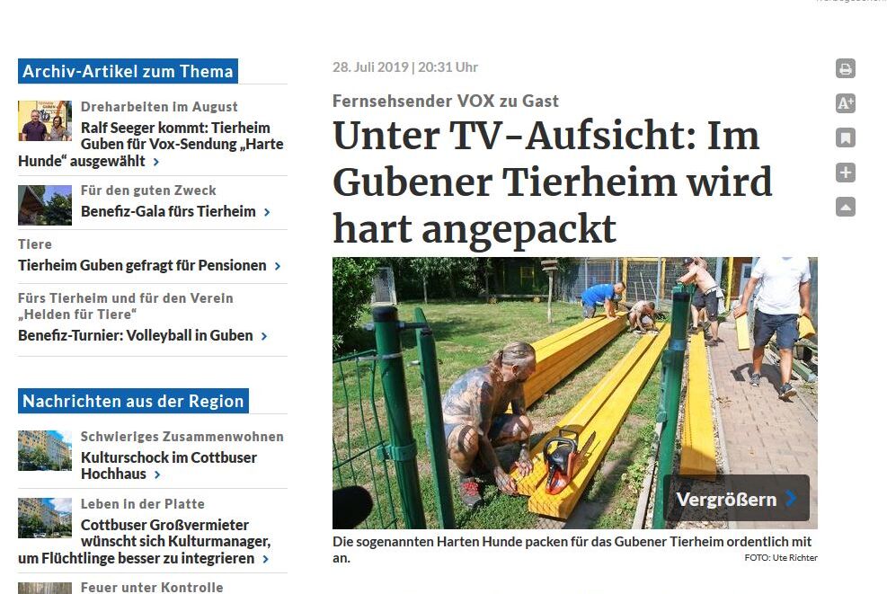Die Dreharbeiten für die VOX Sendung "Harte Hunde - Ralf Seeger greift ein" sind im vollen Gange. Wie schon berichtet ist das größte „Sorgenkind“ im Tierheim Guben schon länger die Überdachung des großen Katzenfreigeheges, welches bis letzte Woche nur mit einem Netz gesichert war.