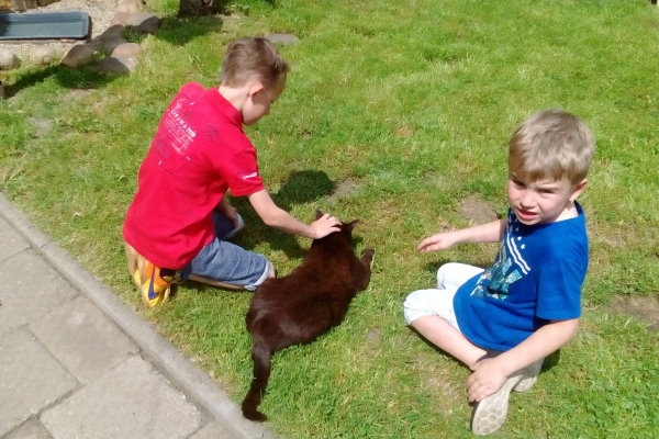 Aufgeteilt in drei Gruppen lernten die ca. 30 Kinder die Tier-Unterkünfte kennen, konnten ausgiebige Streicheleinheiten verteilen, mit einigen Katzen ordentlich schmusen oder ihnen beim Faulenzen zusehen. Der besondere Tag, an dem die Kinder auf intensive Tuchfühlung mit den Tieren gingen, hatte darüber hinaus noch einen Lern-Effekt: Sämtliche Fragen zur Haltung von Katzen wurden beantwortet und dabei insbesondere die Pflichten erklärt, die damit einhergehen. Der Star des Tages war Willi, er ließ die Kinderaugen leuchten: Im gleichen Alter wie der Großteil des Menschenbesuchs, war der junge Mischlingshund natürlich für jede Tobeeinheit höchst empfänglich! Das Team vom Tierheim freute sich sehr, dass die Kinder so viele Spenden mitbrachten. Leiterin Kerstin Martin bedankte sich im Namen aller Kollegen herzlich dafür. Das Fazit: Ein gelungener Tag mit schönen Stunden für alle.