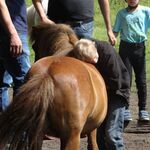 Wir gingen mit der Gruppe zu den Ponys. Dort war die Freude groß, bei Kindern und Ponys gleichermaßen. Es wurde mit Hingabe gestreichelt, getätschelt und umarmt. Nach den ersten innigen Kontaktaufnahmen wurde unter eifriger Mithilfe der Kinder das Ponyareal von Pferdeäpfeln und Strohresten befreit und den Tieren ihre tägliche Heuration vorgelegt.