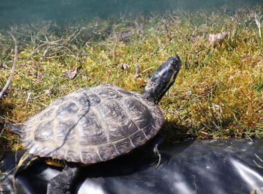 Verschiedene Wasserschildkröten, darunter Gelbwangen- und Rotwangenschildkröten sowie Hieroglyphen-Schmuckschildkröten stehen zur Vermittlung - für Teichhaltung - bereit.